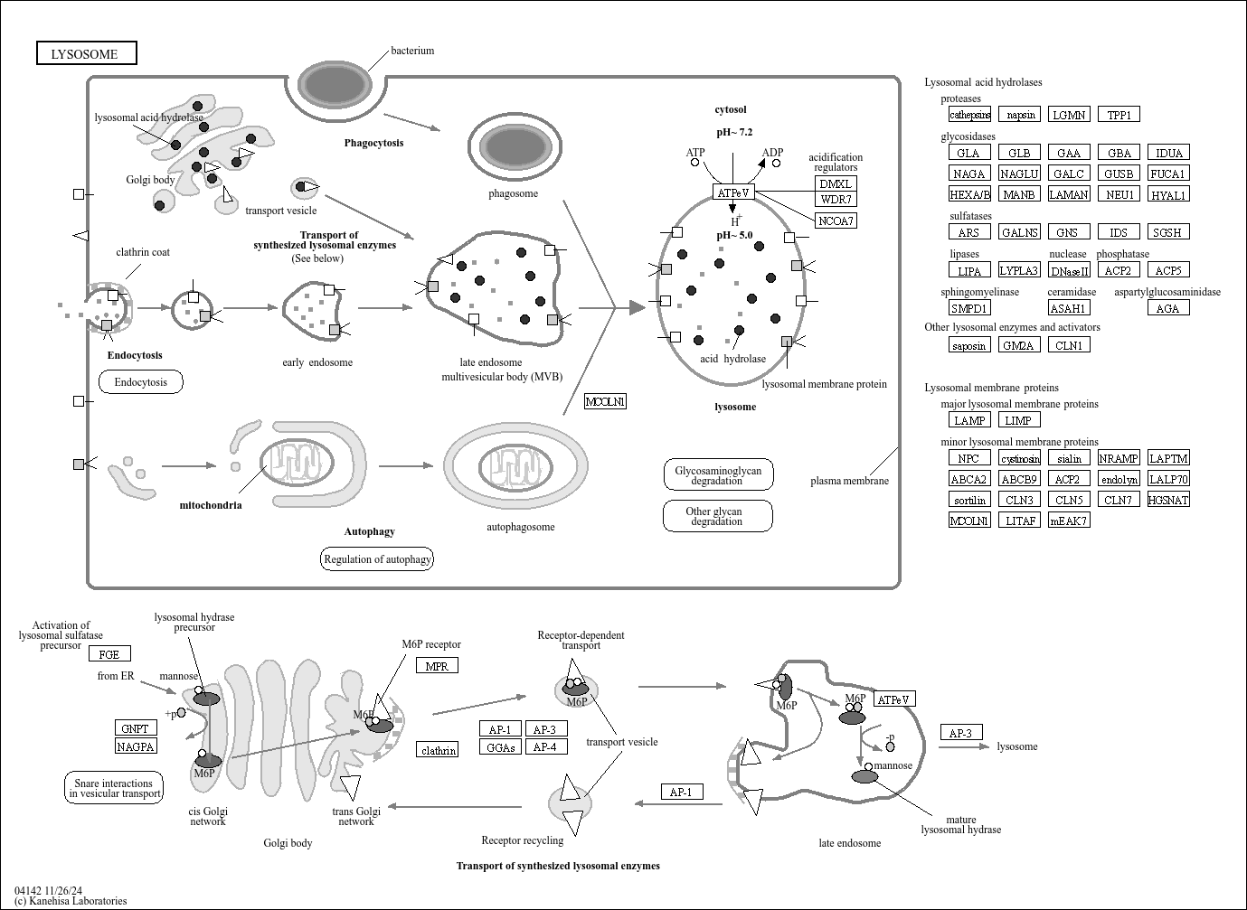 核心关键蛋白: 酸性水解酶(组织蛋白酶 B/D/L、β- 葡萄糖脑苷脂酶、鞘磷脂酶)、V-ATP 酶(溶酶体膜质子泵,维持酸性环境)、溶酶体膜蛋白(LAMP1/LAMP2、CD63)、mTORC1 复合物(定位于溶酶体膜,调控代谢)、自噬相关蛋白(LC3、p62,介导自噬体 - 溶酶体融合)、Rab GTPases(Rab7/Rab5,调控溶酶体转运与融合)、组织蛋白酶抑制剂(cystatins,调控水解酶活性)、NPC1/NPC2(溶酶体胆固醇转运蛋白)。