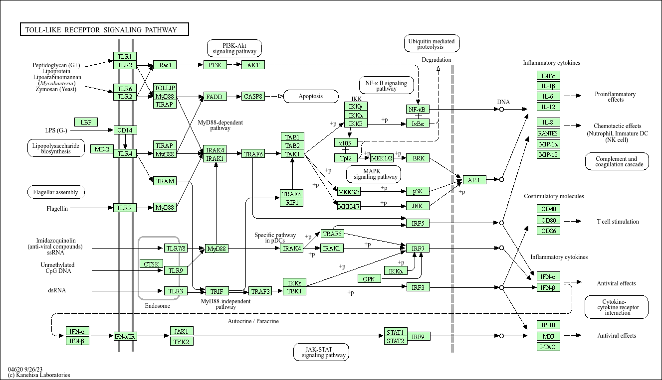 核心关键蛋白:TLR1-10(受体家族)、MyD88、TRIF(信号适配器)、IRAK4、TAK1(激酶)、NF-κB(p65/p50)、MAPK(p38/ERK/JNK)、IFN-α/β、TNF-α、IL-6、TOLLIP(负调控因子)、MD2(TLR4 辅助蛋白)、CD14(LPS 结合蛋白)。