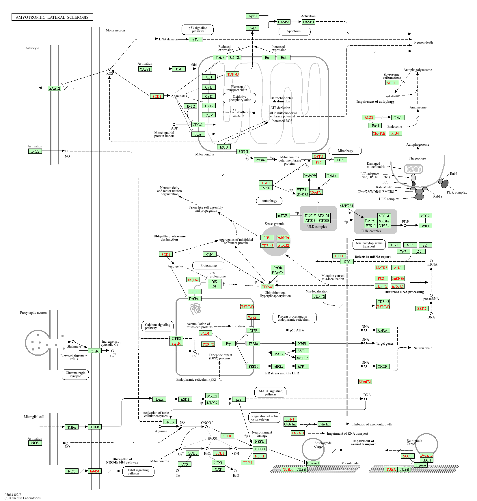 核心关键蛋白:SOD1(超氧化物歧化酶 1,突变导致氧化应激)、TDP-43/FUS(RNA 结合蛋白,突变后异常聚集)、C9orf72(基因扩增导致神经元损伤)、ALS2/OPTN(自噬相关蛋白,功能异常)、p62/LC3(自噬标志物,反映自噬功能)。