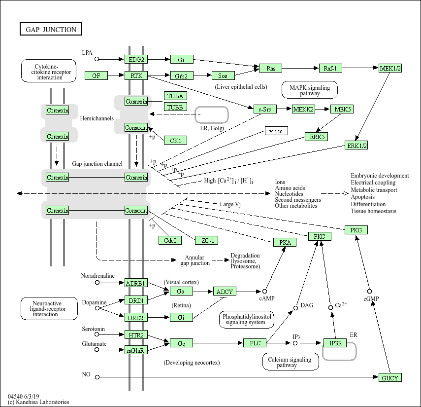 核心关键蛋白: 连接蛋白家族(Cx43、Cx32、Cx40 等)、连接子(Connexon)、钙调蛋白(CaM,调控通道活性)、蛋白激酶(PKA、PKC,介导连接蛋白磷酸化)、离子(Ca²⁺、K⁺)、第二信使(cAMP、IP3)、心肌细胞 / 神经细胞 / 上皮细胞(高表达间隙连接的细胞类型)。