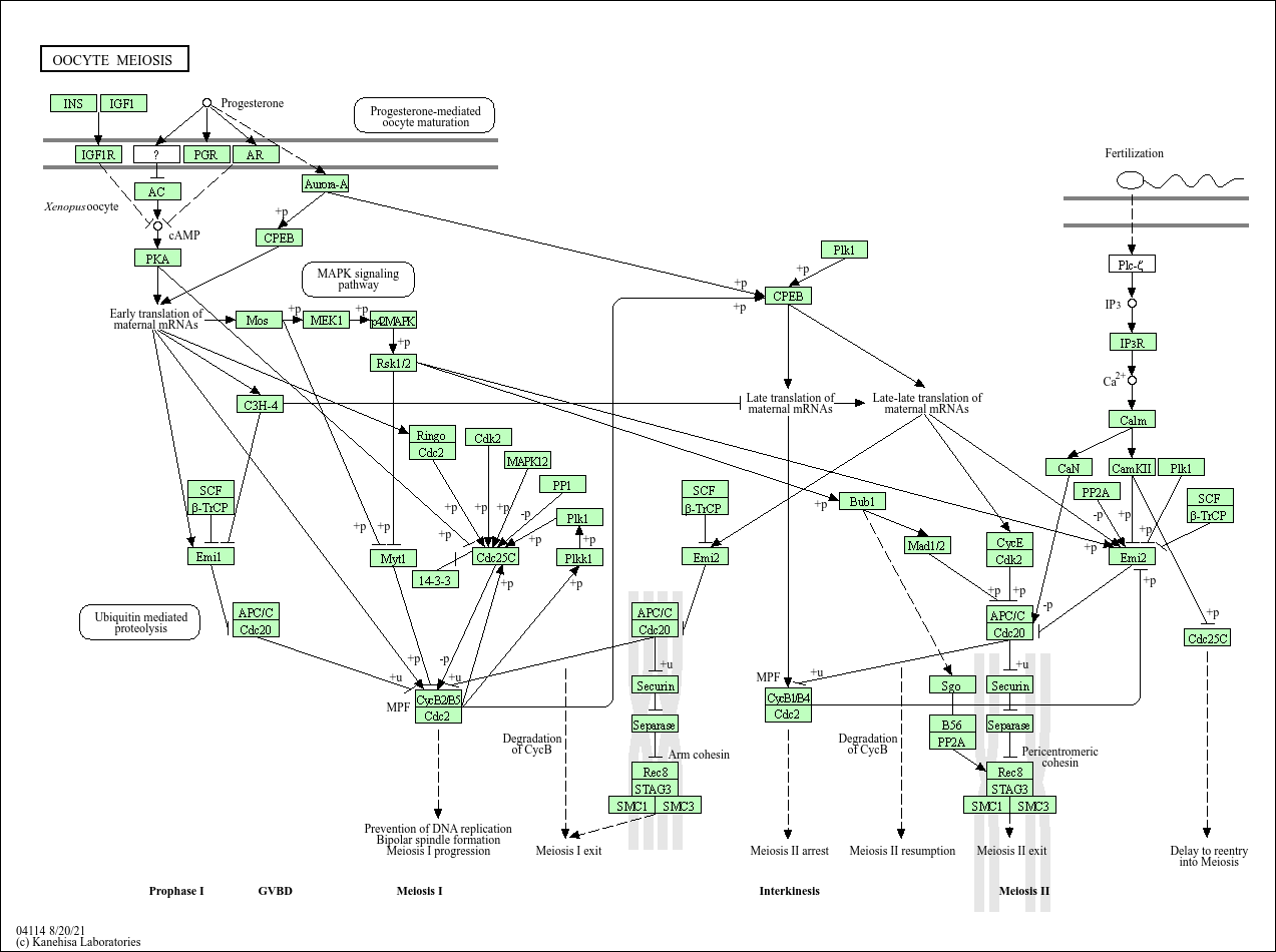 核心关键蛋白: 成熟促进因子(MPF:Cyclin B、CDK1)、Cdc25 磷酸酶(激活 CDK1)、Wee1 激酶(抑制 CDK1)、APC/C 复合物(降解 Cyclin B)、钙调素依赖性蛋白激酶 II(CaMKII,受精后激活)、促黄体生成素受体(LHR,启动减数分裂恢复)、Mos 激酶(激活 MAPK 通路,维持 MII 期停滞)、MAPK(ERK1/2,调控减数分裂进程)、细胞骨架蛋白(微管、肌动蛋白,调控染色体分离与极性)、卵母细胞特异性蛋白(Bub3、Emi2,调控减数分裂检查点)。