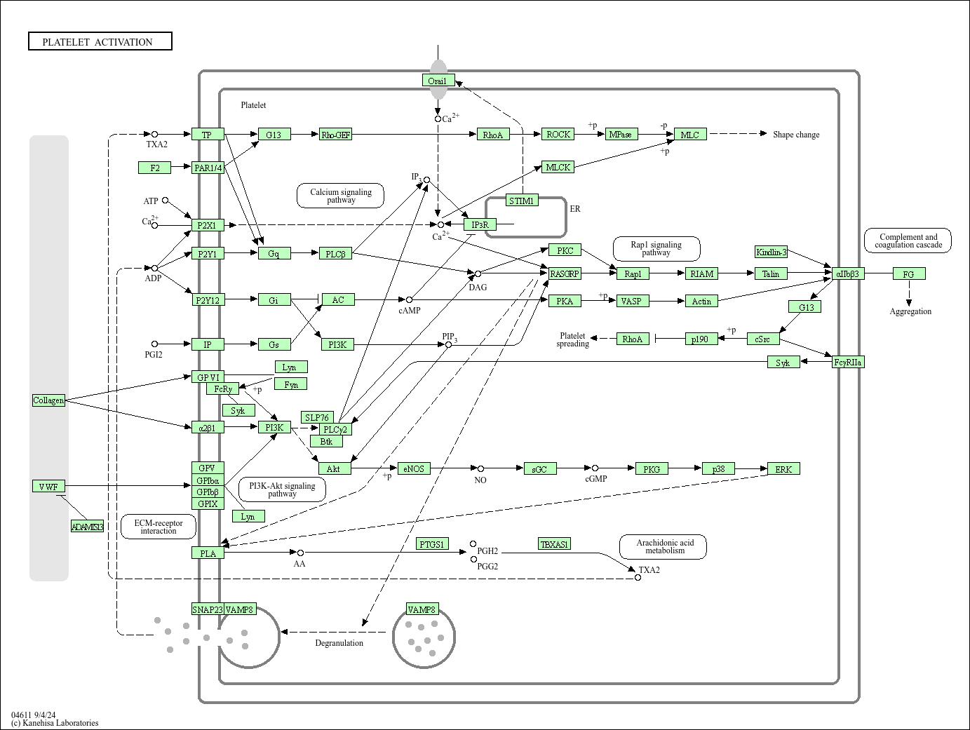核心关键蛋白:血小板、GPVI(胶原受体)、GPIb-IX-V(vWF 受体)、GPⅡb/Ⅲa(纤维蛋白原受体)、vWF(血管性血友病因子)、ADP(二次激活信号)、TXA2(血栓素 A2)、P2Y12(ADP 受体)、TP(TXA2 受体)、PLC-γ2(信号通路关键酶)、PI3K/Akt(信号通路核心分子)、PKC(钙信号下游激酶)、钙调蛋白(CaM)、血栓素合成酶(TXS)、纤维蛋白原(血小板聚集交联分子)。