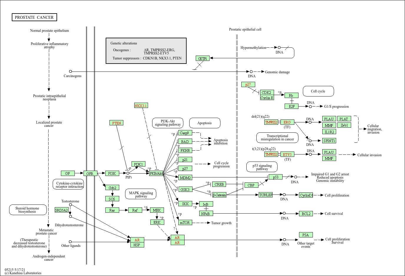 核心关键蛋白:AR(雄激素受体,介导激素依赖性增殖)、PSA(前列腺特异性抗原,诊断标志物)、PI3K/Akt/mTOR(信号通路,增强存活与代谢)、PTEN(失活促进通路激活)、TP53(抑癌基因,突变与进展相关)、MYC(转录因子,促增殖)、VEGF(血管生成)。