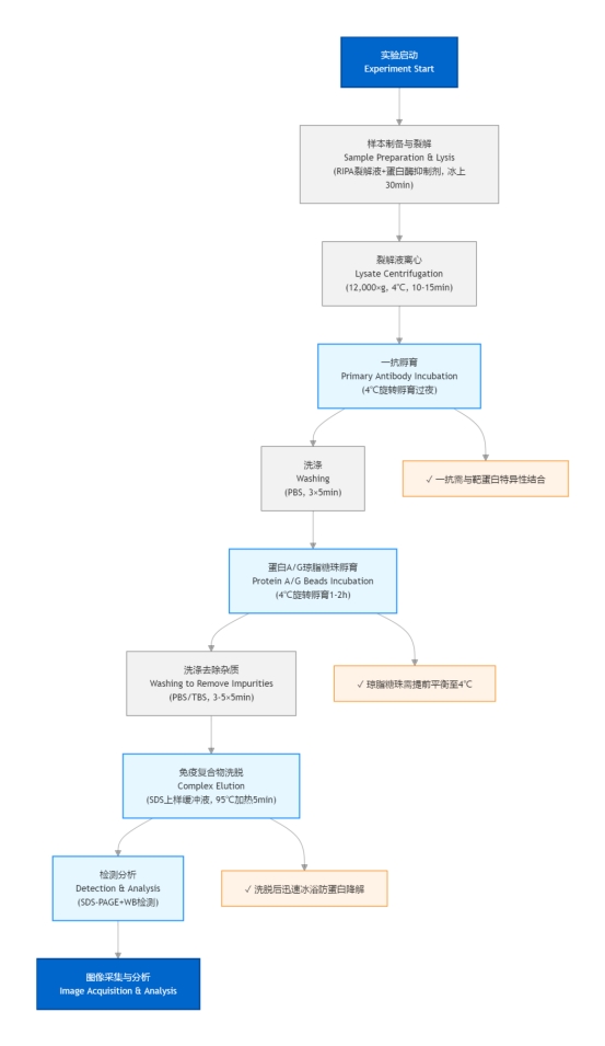 - 核心试剂:特异性一抗(针对目标蛋白)、阴性对照抗体(如无关 IgG,排除非特异性结合)、Protein A/G 磁珠/琼脂糖珠(用于捕获抗体-抗原复合物)。