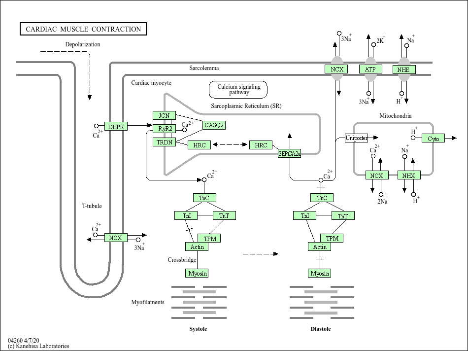 核心关键蛋白:心肌肌动蛋白(Actin)、心肌肌球蛋白(Myosin)、肌钙蛋白(TnC、TnI、TnT)、原肌球蛋白(Tropomyosin)、L 型钙通道(LTCC)、RyR2(肌浆网钙释放通道)、SERCA(肌浆网钙 ATP 酶)、PLB(受磷蛋白,调控 SERCA 活性)、钙调蛋白(CaM)、钠钙交换体(NCX)、ATP(能量供体)、心肌细胞、肌浆网。
