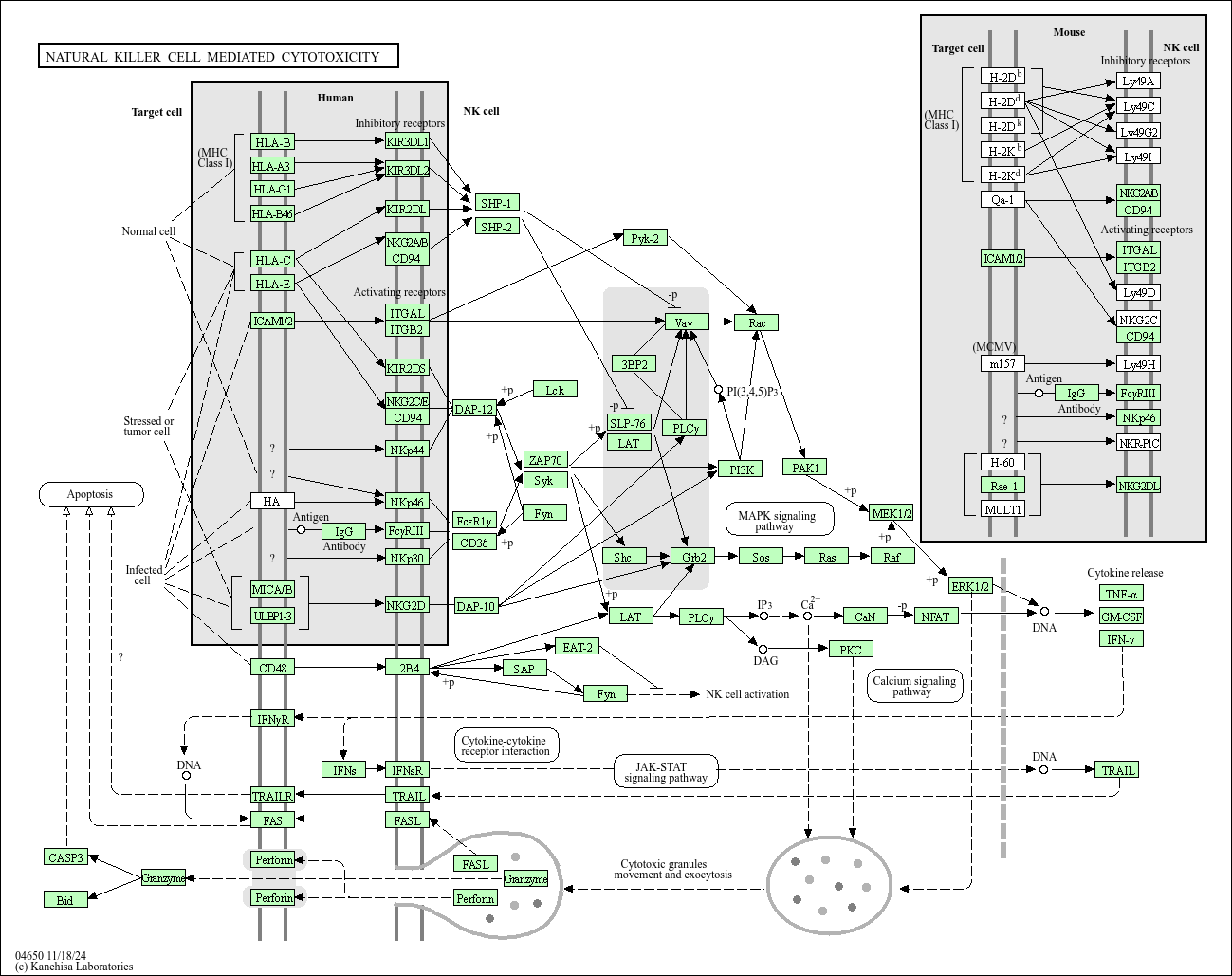 核心关键蛋白:NK 细胞受体(NKG2D、KIR 家族、NKp30/NKp46)、穿孔素(Perforin)、颗粒酶 B(Granzyme B)、Fas/FasL、TNF-α/TNFR1、caspase-3/8(凋亡执行酶)、MICA/B(应激分子)、IFN-γ(增强杀伤活性)、Eomes/T-bet(NK 细胞功能调控转录因子)。