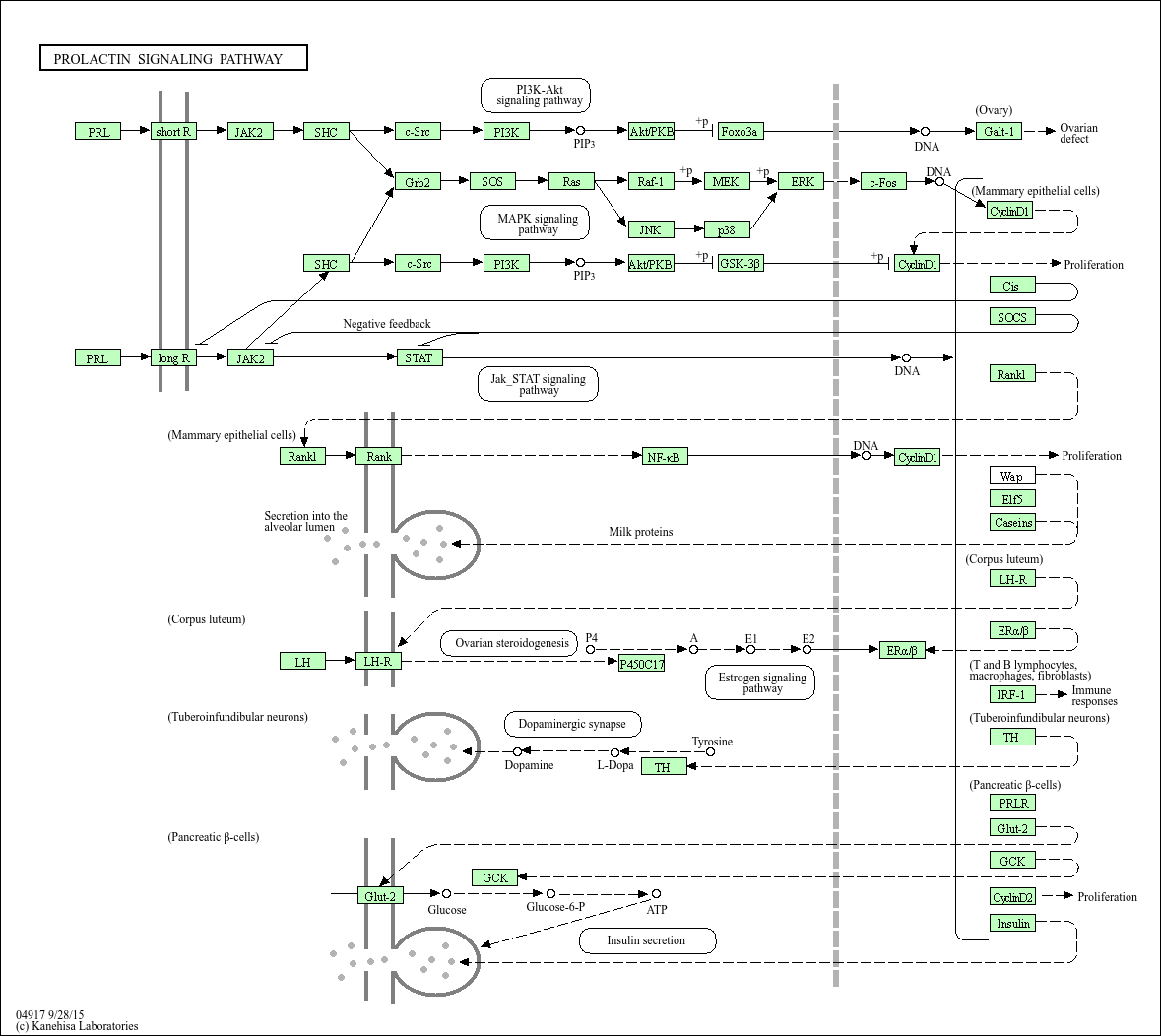 核心关键蛋白:催乳素(PRL)、催乳素受体(PRLR)、JAK2(酪氨酸激酶)、STAT5(信号转导与转录激活因子 5)、β- 酪蛋白 / 乳清酸蛋白(泌乳相关靶基因)、PI3K/Akt(增殖与存活信号通路)、MAPK(ERK,丝裂原活化蛋白激酶)、多巴胺(DA,负调控因子)、D2 受体(多巴胺受体)、SOCS1/SOCS3(细胞因子信号抑制因子,负调控因子)、Cyclin D1(细胞周期蛋白,促进增殖)、乳腺上皮细胞。