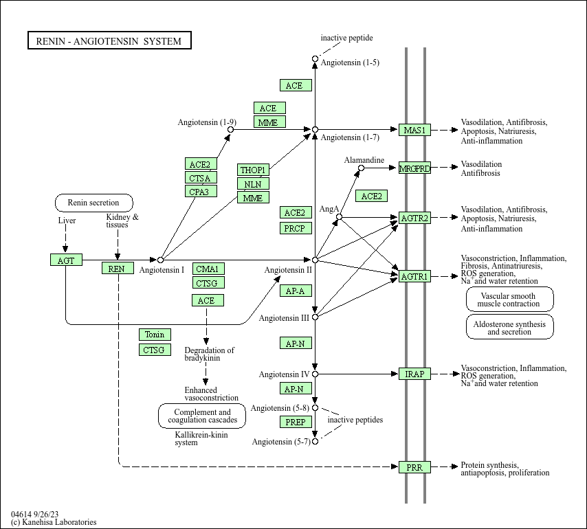 基础研究核心:解析 RAAS 系统调控血压、水钠平衡及血管重塑的分子机制,是心血管稳态的关键调控通路。当血压下降、血容量减少或肾血流量不足时,肾脏球旁细胞分泌肾素;肾素将肝脏合成的血管紧张素原水解为血管紧张素 I(Ang I);Ang I 经肺循环中血管紧张素转换酶(ACE)水解,生成核心效应分子血管紧张素 II(Ang II)。Ang II 与靶细胞(血管平滑肌细胞、肾上腺球状带细胞、肾小管上皮细胞)表面 AT1R 结合,激活下游信号:在血管平滑肌细胞中,激活 PLC-γ-PKC 通路引发血管收缩,升高血压;在肾上腺球状带细胞中,促进醛固酮分泌,增强肾脏钠重吸收;在肝脏和肾脏中,促进水钠潴留并激活血管重塑相关基因。此外,Ang 1-7(Ang II 经 ACE2 水解产物)可与 Mas 受体结合,拮抗 Ang II 的收缩血管作用,维持通路平衡。研究重点包括肾素分泌的调控机制、ACE/ACE2 的平衡作用、Ang II-AT1R 轴的信号转导、通路过度激活与高血压、心力衰竭、肾脏疾病的关联,以及 RAAS 抑制剂(ACEI、ARB、肾素抑制剂)的治疗机制。