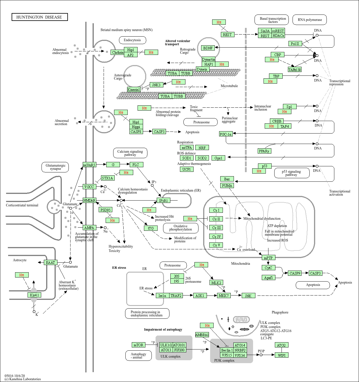 核心关键蛋白:mHTT(突变亨廷顿蛋白,异常聚集产生毒性)、HAP1(与 mHTT 结合,影响细胞转运)、p53(介导 mHTT 诱导的凋亡)、CASP3(胱天蛋白酶 3,执行凋亡)、BDNF(脑源性神经营养因子,表达下降导致神经元损伤)、NMDA 受体(过度激活加重神经元损伤)。