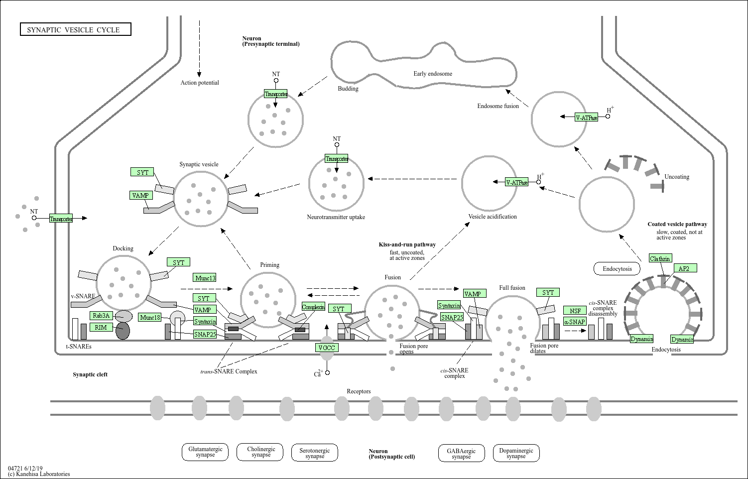核心关键蛋白:突触小泡(Synaptic vesicle)、SNARE 复合物(Syntaxin 1A、VAMP2、SNAP-25)、Synaptotagmin(钙离子传感器,介导胞吐触发)、网格蛋白(Clathrin,内吞相关蛋白)、Dynamin(GTP 酶,介导内吞囊泡脱落)、V-ATP 酶(突触小泡酸化酶)、神经递质转运体(VAChT、DAT、VMAT,填充神经递质)、Rab GTPases(Rab3/Rab5,小泡转运与分选)、Munc18(膜融合调控蛋白)、α-Synuclein(突触小泡功能调控蛋白)。