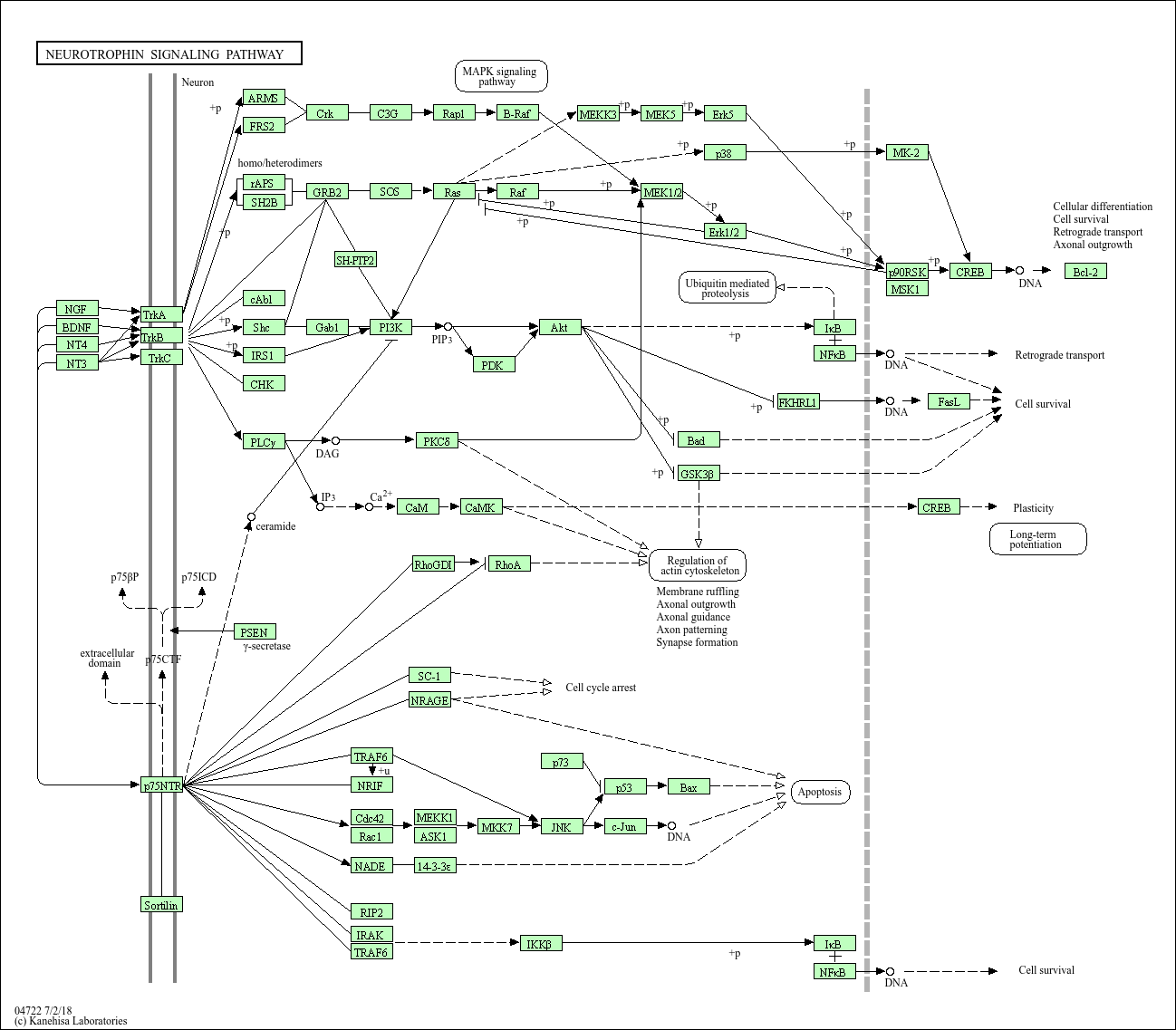 核心关键蛋白:神经营养因子(NGF、BDNF、NT-3、NT-4)、TrkA/TrkB/TrkC(酪氨酸激酶受体)、p75NTR(神经营养因子受体,低亲和力)、PI3K/Akt(存活信号通路)、Ras/Raf/MEK/ERK(MAPK 通路,分化信号)、PLC-γ(磷脂酶 C-γ)、IP3R(内质网钙离子通道)、CaMKII(钙调蛋白依赖性激酶 II)、BAD(凋亡相关蛋白,Akt 磷酸化抑制其活性)、CREB(转录因子,调控突触可塑性基因)、神经元、神经胶质细胞。