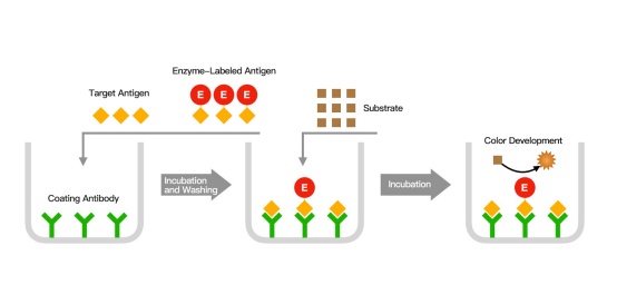 1.  原理:将特异性抗体包被于固相载体,加入待检样本(含未标记靶标抗原)与标记靶标抗原的混合液;样本中的未标记抗原与标记抗原竞争结合固相载体上的抗体,样本中未标记抗原浓度越高,结合到抗体上的标记抗原越少,最终检测到的信号越弱;通过信号强度与标准品浓度的比对,实现样本中靶标抗原的定量。