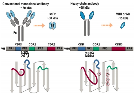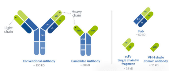天然缺失轻链,仅由重链可变区(VHH)构成功能核心,其结构具有三大特征: