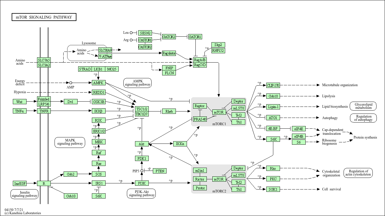 51384 (WNT16), 54361 (WNT4), 7471 (WNT1), 7472 (WNT2), 7473 (WNT3), 7474 (WNT5A), 7475 (WNT6), 7476 (WNT7A), 7477 (WNT7B), 7478 (WNT8A), 7479 (WNT8B), 7480 (WNT10B), 7481 (WNT11), 7482 (WNT2B), 7483 (WNT9A), 7484 (WNT9B), 80326 (WNT10A), 81029 (WNT5B), 89780 (WNT3A)7124 (TNF)3479 (IGF1), 3630 (INS)3480 (IGF1R), 3643 (INSR)7132 (TNFRSF1A)4040 (LRP6), 4041 (LRP5)11211 (FZD10), 2535 (FZD2), 7855 (FZD5), 7976 (FZD3), 8321 (FZD1), 8322 (FZD4), 8323 (FZD6), 8324 (FZD7), 8325 (FZD8), 8326 (FZD9)6520 (SLC3A2)8140 (SLC7A5)1855 (DVL1), 1856 (DVL2), 1857 (DVL3)2885 (GRB2)2887 (GRB10)153129 (SLC38A9)101927180 (ATP6V1FP2), 127124 (ATP6V1G3), 245973 (ATP6V1C2), 51382 (ATP6V1D), 51606 (ATP6V1H), 523 (ATP6V1A), 525 (ATP6V1B1), 526 (ATP6V1B2), 528 (ATP6V1C1), 529 (ATP6V1E1), 534 (ATP6V1G2), 90423 (ATP6V1E2), 9296 (ATP6V1F), 9550 (ATP6V1G1)55437 (STRADB), 92335 (STRADA)6794 (STK11)51719 (CAB39), 81617 (CAB39L)5562 (PRKAA1), 5563 (PRKAA2)54541 (DDIT4)2932 (GSK3B)3551 (IKBKB)27330 (RPS6KA6), 6195 (RPS6KA1), 6196 (RPS6KA2), 6197 (RPS6KA3)5594 (MAPK1), 5595 (MAPK3)5604 (MAP2K1), 5605 (MAP2K2)5894 (RAF1), 673 (BRAF)3265 (HRAS), 3845 (KRAS), 4893 (NRAS)6654 (SOS1), 6655 (SOS2)3667 (IRS1)6198 (RPS6KB1), 6199 (RPS6KB2)83667 (SESN2)652968 (CASTOR1)729438 (CASTOR2)54468 (MIOS), 6396 (SEC13), 79726 (WDR59), 81929 (SEH1L), 84219 (WDR24)10641 (NPRL2), 8131 (NPRL3), 9681 (DEPDC5)10542 (LAMTOR5), 28956 (LAMTOR2), 389541 (LAMTOR4), 55004 (LAMTOR1), 8649 (LAMTOR3)57600 (FNIP2), 96459 (FNIP1)201163 (FLCN)10325 (RRAGB), 10670 (RRAGA)58528 (RRAGD), 64121 (RRAGC)6502 (SKP2)220441 (RNF152)7248 (TSC1), 7249 (TSC2)107080638, 51256 (TBC1D7)6009 (RHEB)57521 (RPTOR)84335 (AKT1S1)2475 (MTOR)64798 (DEPTOR)64223 (MLST8)9894 (TELO2)9675 (TTI1)10000 (AKT3), 207 (AKT1), 208 (AKT2)1147 (CHUK)5170 (PDPK1)5728 (PTEN)110117499 (P3R3URF-PIK3R3), 5290 (PIK3CA), 5291 (PIK3CB), 5293 (PIK3CD), 5295 (PIK3R1), 5296 (PIK3R2), 8503 (PIK3R3)79109 (MAPKAP1)253260 (RICTOR)55615 (PRR5), 79899 (PRR5L)2475 (MTOR)64798 (DEPTOR)64223 (MLST8)9894 (TELO2)9675 (TTI1)6249 (CLIP1)2887 (GRB10)23175 (LPIN1), 64900 (LPIN3), 9663 (LPIN2)8408 (ULK1), 9706 (ULK2)1978 (EIF4EBP1)1977 (EIF4E), 253314 (EIF4E1B), 9470 (EIF4E2)6198 (RPS6KB1), 6199 (RPS6KB2)1975 (EIF4B)6194 (RPS6)387 (RHOA)5578 (PRKCA), 5579 (PRKCB), 5582 (PRKCG)6446 (SGK1)