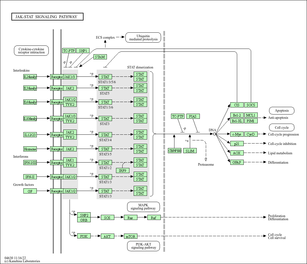 3558 (IL2), 3565 (IL4), 3574 (IL7), 3578 (IL9), 3600 (IL15), 59067 (IL21), 85480 (TSLP)1437 (CSF2), 3562 (IL3), 3567 (IL5)1270 (CNTF), 1489 (CTF1), 23529 (CLCF1), 246778 (IL27), 3569 (IL6), 3589 (IL11), 3596 (IL13), 386653 (IL31), 3976 (LIF), 5008 (OSM)11009 (IL24), 29949 (IL19), 3586 (IL10), 50604 (IL20), 50616 (IL22), 55801 (IL26)3592 (IL12A), 3593 (IL12B), 51561 (IL23A)1440 (CSF3), 1442 (CSH1), 1443 (CSH2), 1444 (CSHL1), 2056 (EPO), 2688 (GH1), 2689 (GH2), 3952 (LEP), 5617 (PRL), 7066 (THPO)282616 (IFNL2), 282617 (IFNL3), 282618 (IFNL1), 338376 (IFNE), 3439 (IFNA1), 3440 (IFNA2), 3441 (IFNA4), 3442 (IFNA5), 3443 (IFNA6), 3444 (IFNA7), 3445 (IFNA8), 3446 (IFNA10), 3447 (IFNA13), 3448 (IFNA14), 3449 (IFNA16), 3451 (IFNA17), 3452 (IFNA21), 3456 (IFNB1), 3467 (IFNW1), 56832 (IFNK)3458 (IFNG)1950 (EGF), 5154 (PDGFA), 5155 (PDGFB)3559 (IL2RA), 3560 (IL2RB), 3561 (IL2RG), 3566 (IL4R), 3575 (IL7R), 3581 (IL9R), 3601 (IL15RA), 50615 (IL21R), 64109 (CRLF2)1438 (CSF2RA), 1439 (CSF2RB), 3563 (IL3RA), 3568 (IL5RA)1271 (CNTFR), 133396 (IL31RA), 3566 (IL4R), 3570 (IL6R), 3572 (IL6ST), 3590 (IL11RA), 3597 (IL13RA1), 3598 (IL13RA2), 3977 (LIFR), 9180 (OSMR), 9466 (IL27RA)116379 (IL22RA2), 3587 (IL10RA), 3588 (IL10RB), 53832 (IL20RA), 53833 (IL20RB), 58985 (IL22RA1)149233 (IL23R), 3594 (IL12RB1), 3595 (IL12RB2)1441 (CSF3R), 2057 (EPOR), 2690 (GHR), 3953 (LEPR), 4352 (MPL), 5618 (PRLR)163702 (IFNLR1), 3454 (IFNAR1), 3455 (IFNAR2), 3588 (IL10RB)3459 (IFNGR1), 3460 (IFNGR2)1956 (EGFR), 5156 (PDGFRA), 5159 (PDGFRB)5771 (PTPN2)5777 (PTPN6)10254 (STAM2), 8027 (STAM)3716 (JAK1), 3718 (JAK3)6772 (STAT1), 6774 (STAT3), 6776 (STAT5A), 6777 (STAT5B), 6778 (STAT6)6772 (STAT1), 6774 (STAT3), 6776 (STAT5A), 6777 (STAT5B), 6778 (STAT6)3717 (JAK2)6776 (STAT5A), 6777 (STAT5B)6776 (STAT5A), 6777 (STAT5B)3716 (JAK1), 3717 (JAK2)7297 (TYK2)6772 (STAT1), 6774 (STAT3), 6778 (STAT6)6772 (STAT1), 6774 (STAT3), 6778 (STAT6)3716 (JAK1), 3718 (JAK3)7297 (TYK2)6774 (STAT3)6774 (STAT3)3717 (JAK2)7297 (TYK2)6774 (STAT3), 6775 (STAT4)6774 (STAT3), 6775 (STAT4)3717 (JAK2)6774 (STAT3), 6776 (STAT5A), 6777 (STAT5B)6774 (STAT3), 6776 (STAT5A), 6777 (STAT5B)3716 (JAK1)7297 (TYK2)6772 (STAT1), 6773 (STAT2)6772 (STAT1), 6773 (STAT2)10379 (IRF9)3716 (JAK1), 3717 (JAK2)6772 (STAT1), 6774 (STAT3)6772 (STAT1), 6774 (STAT3)3716 (JAK1), 3717 (JAK2)6772 (STAT1), 6774 (STAT3)6772 (STAT1), 6774 (STAT3)5781 (PTPN11)2885 (GRB2)6654 (SOS1), 6655 (SOS2)3265 (HRAS)5894 (RAF1)110117499 (P3R3URF-PIK3R3), 5290 (PIK3CA), 5291 (PIK3CB), 5293 (PIK3CD), 5295 (PIK3R1), 5296 (PIK3R2), 8503 (PIK3R3)10000 (AKT3), 207 (AKT1), 208 (AKT2)2475 (MTOR)5771 (PTPN2)10401 (PIAS3), 51588 (PIAS4), 8554 (PIAS1), 9063 (PIAS2)1387 (CREBBP), 2033 (EP300)2273 (FHL1)1154 (CISH)122809 (SOCS4), 30837 (SOCS7), 8651 (SOCS1), 8835 (SOCS2), 9021 (SOCS3), 9306 (SOCS6), 9655 (SOCS5)596 (BCL2)4170 (MCL1)598 (BCL2L1)5292 (PIM1)4609 (MYC)595 (CCND1), 894 (CCND2), 896 (CCND3)1026 (CDKN1A)316 (AOX1)2670 (GFAP)