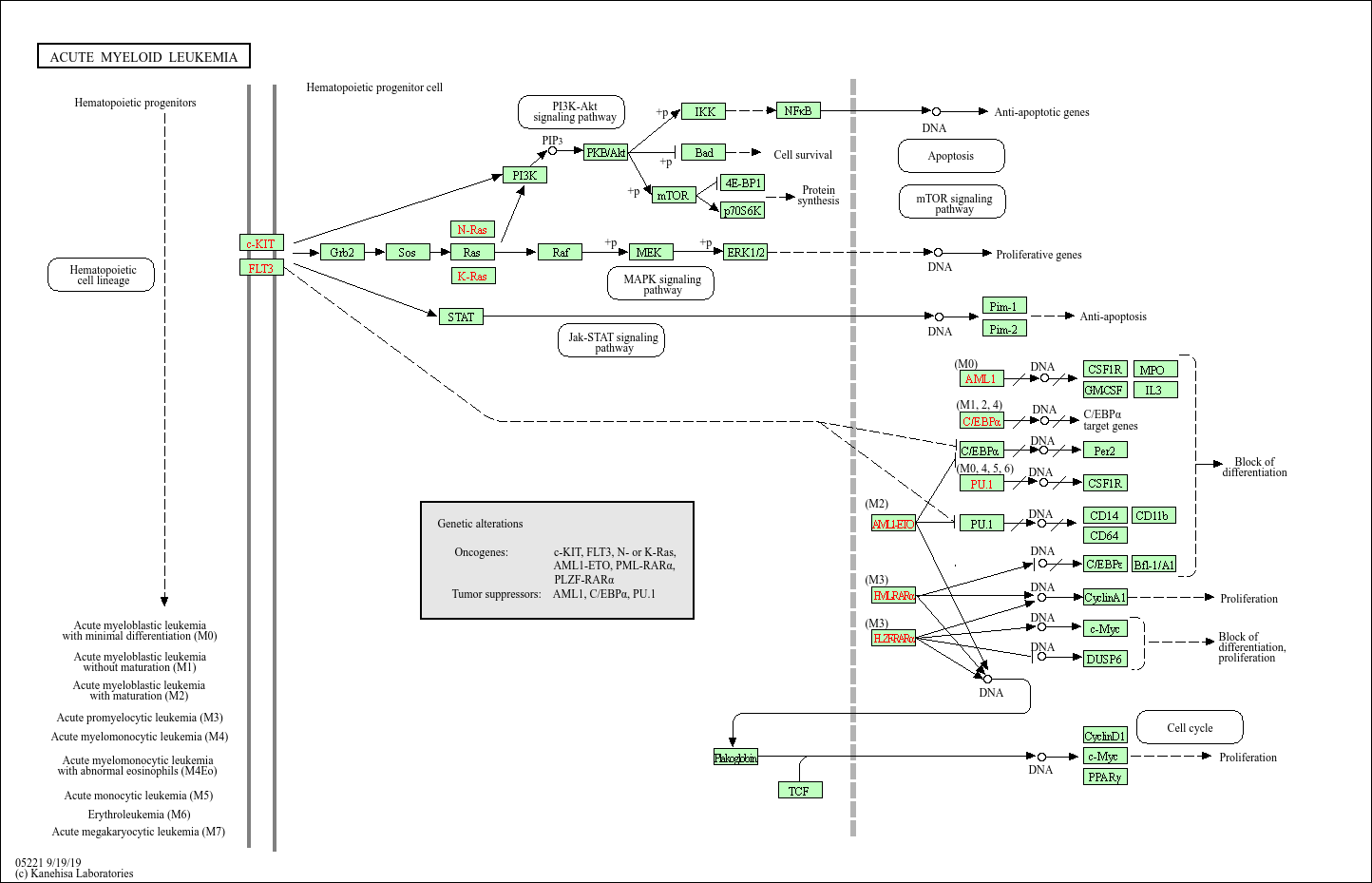 核心关键蛋白:FLT3(突变后持续激活增殖信号)、PML-RARα 融合蛋白(阻断髓系分化)、RUNX1(造血分化关键转录因子)、CEBPA(调控髓系细胞成熟)、c-KIT(干细胞因子受体,突变增强存活信号)、TP53(抑癌基因,失活促进肿瘤进展)。
