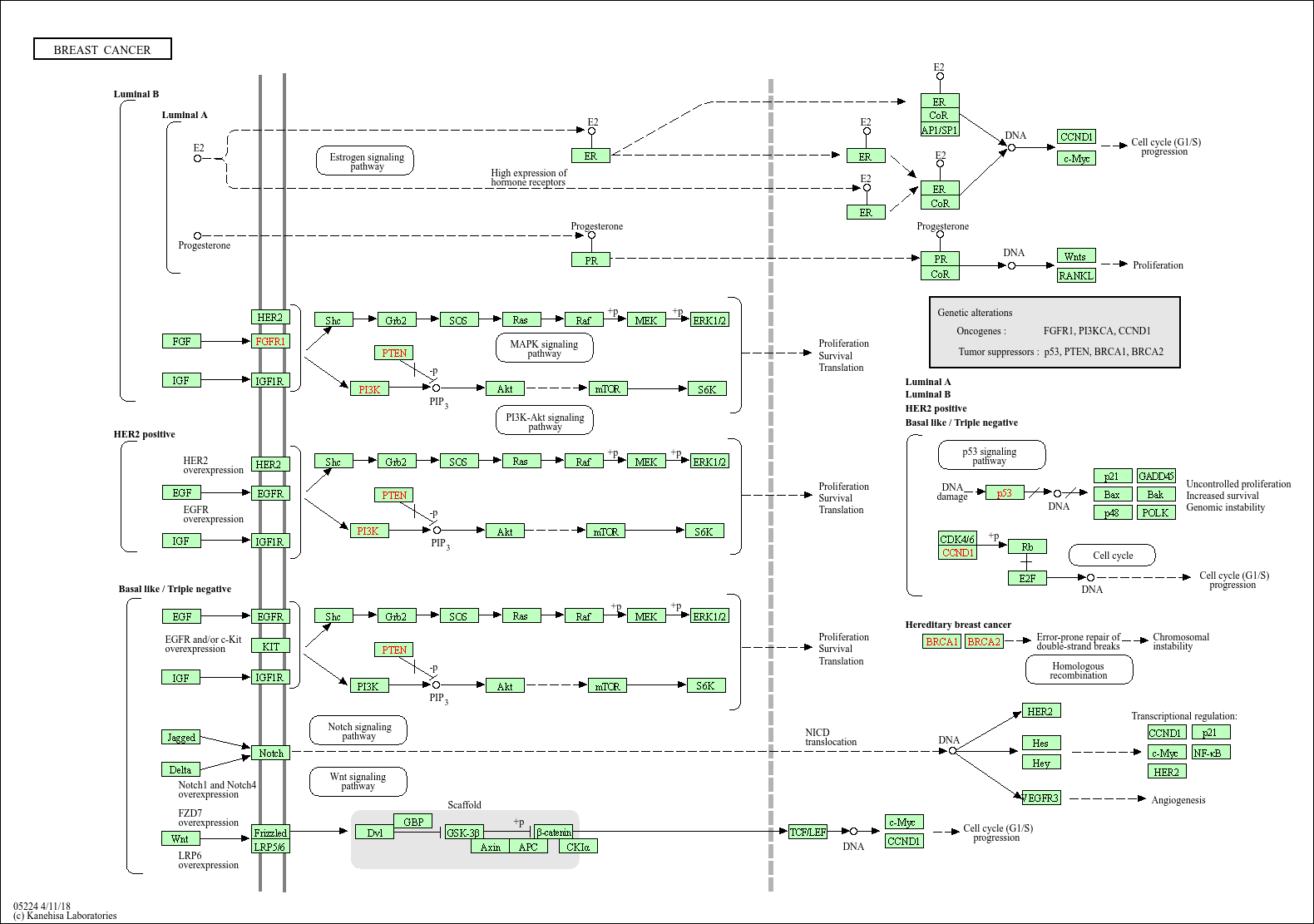 核心关键蛋白:ERα(雌激素受体,介导激素依赖性增殖)、PR(孕激素受体,协同 ER 调控)、HER2(ErbB2,扩增激活 PI3K-Akt/MAPK 通路)、EGFR(三阴性亚型核心驱动分子)、PI3K/Akt/mTOR(信号通路,调控增殖与代谢)、BRCA1/2(DNA 修复基因,突变增加遗传易感性)、TP53(抑癌基因,突变与不良预后相关)。