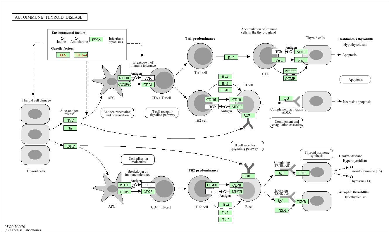 核心关键蛋白:TSHR(促甲状腺激素受体,自身抗体靶点)、TPO(甲状腺过氧化物酶,自身抗体靶点)、Tg(甲状腺球蛋白,自身抗体靶点)、IFN-γ/TNF-α/IL-6(促炎细胞因子)、CD4+ T 细胞 / B 细胞(产生自身抗体)、MHC-II(呈递甲状腺抗原)。